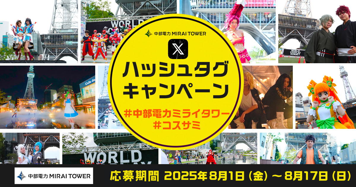 中部電力MIRAI TOWERが写り込んだコスプレ写真をX(旧:Twitter)で下記2つのハッシュタグをつけて投稿しよう!