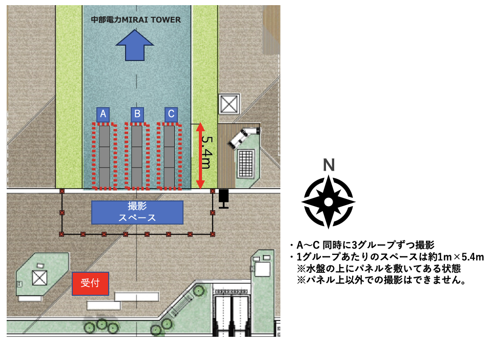 3. 1グループあたりのスペースは1m×5.4mを予定しています。(水盤の上にパネルを敷いてある状態で、パネル上以外での撮影はできません。)