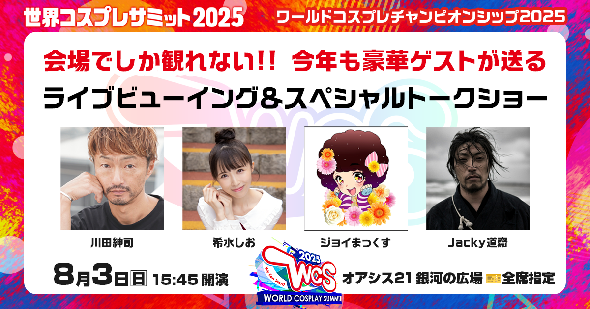 「ライブビューイング&スペシャルトークショー」とは、コスプレの世界No.1を決定する「ワールドコスプレチャンピオンシップ」の模様を大画面で観覧しながら、ゲストによるトークも一緒に楽しめる特別ステージ企画です。