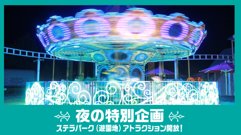 ラグコスの夜は、さまざまなアトラクションが無料で乗れます! ラグナシアのアトラクションを楽しんでくださいね! ステラパーク(遊園地)アトラクション開放! 運営アトラクション(運営時間21:30〜23:00) … 続きを読む 【フル参加限定】夜の特別企画