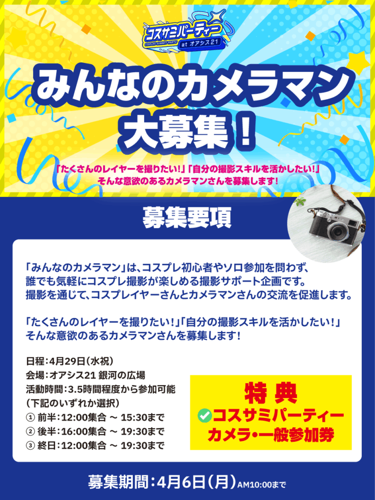 - ご協力いただいたみんなのカメラマンには、コスサミパーティーatオアシス21(4/29開催)のカメラ・一般参加券 をプレゼント!