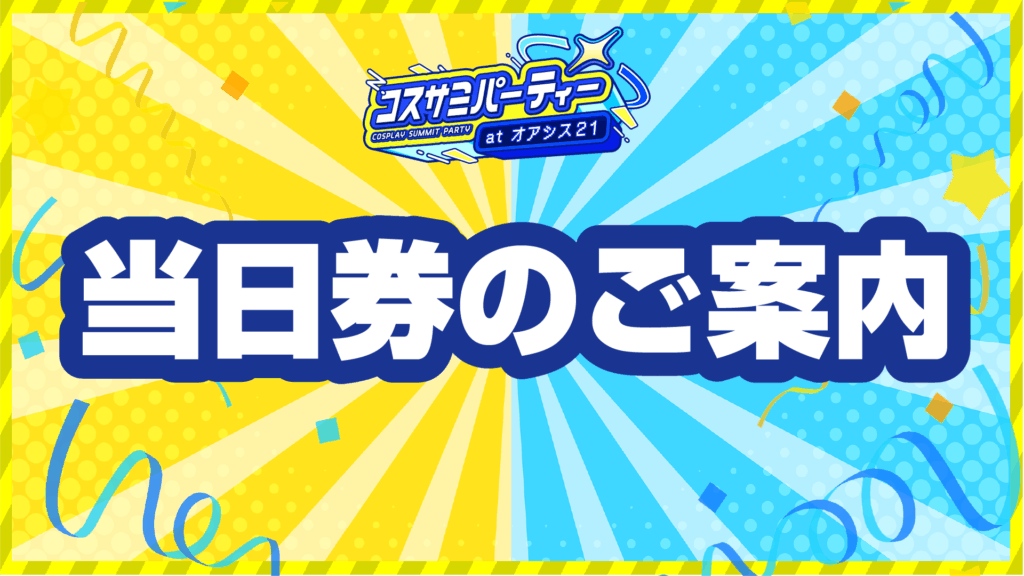 当日券は以下の場所で購入できます。 1)コスサミパーティー会場 オアシス21銀河の広場内「当日券売り場」 ・販売時間:各日11:00販売開始〜19:00 ・対象券種:コスプレ参加券(更衣室なし)、カメラ・一般参加券 ・決 … 続きを読む 当日券のご案内