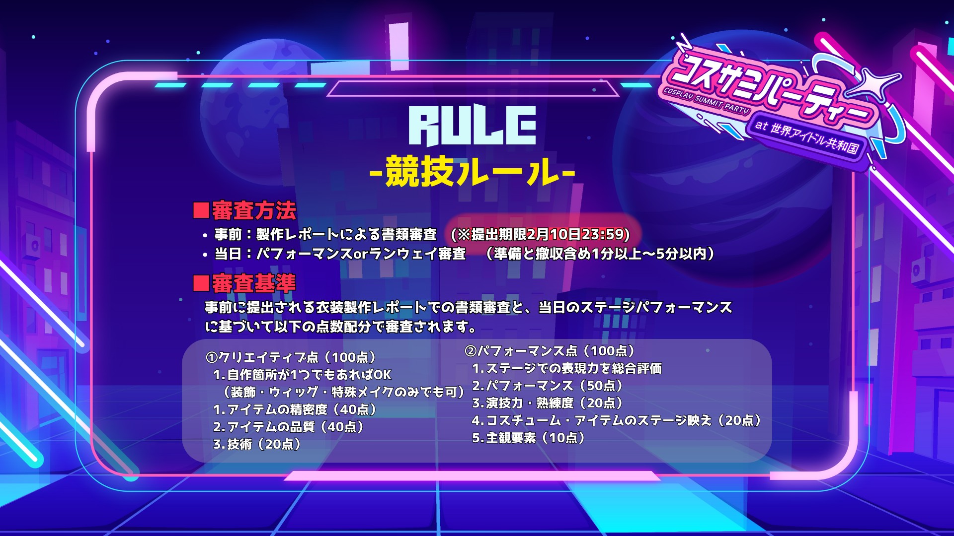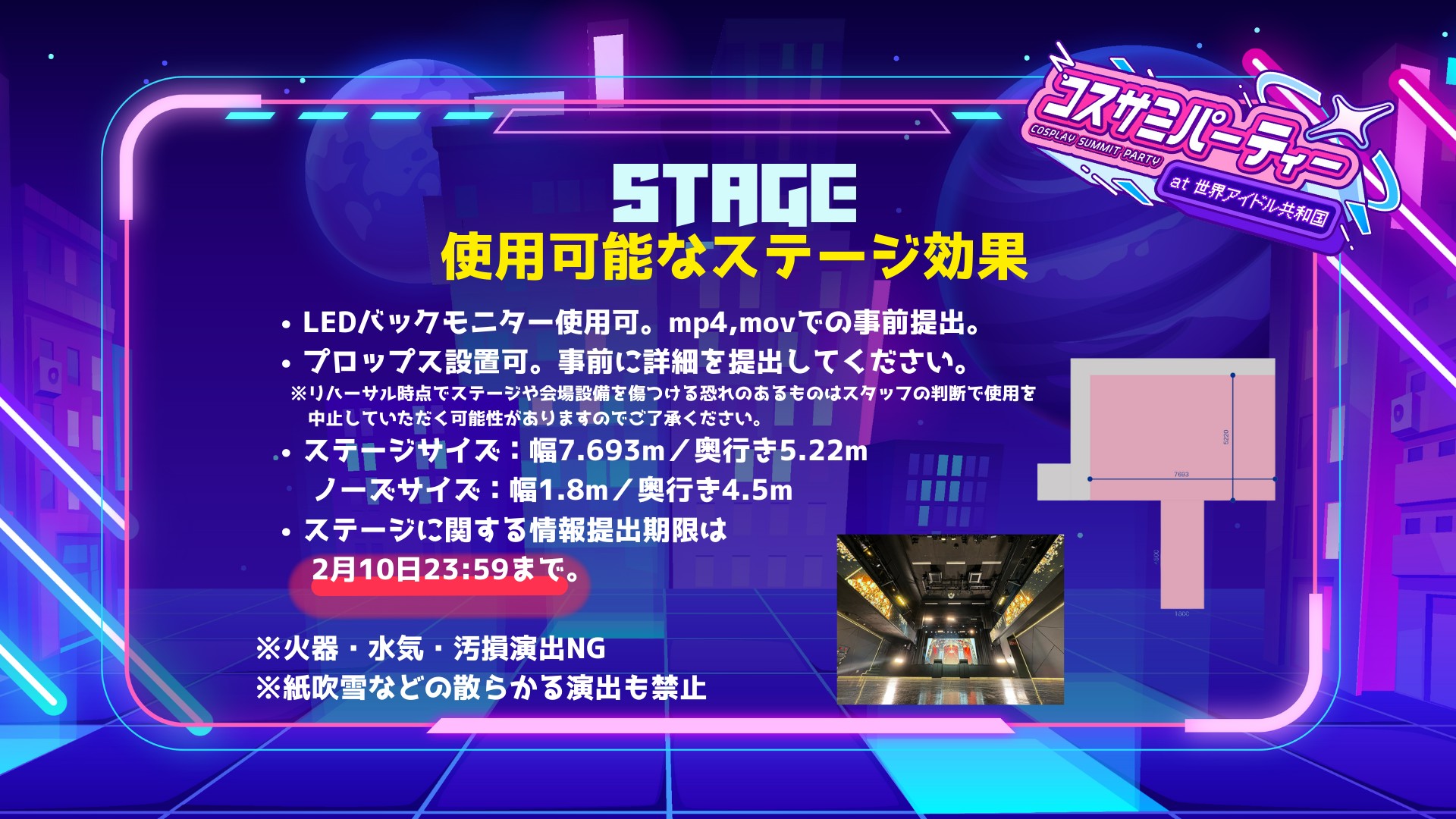 - ステージの写真・映像をSNSで紹介、または今後のコスサミパーティーおよび世界コスプレサミット関連イベントの告知等で使用させていただく場合がございます。