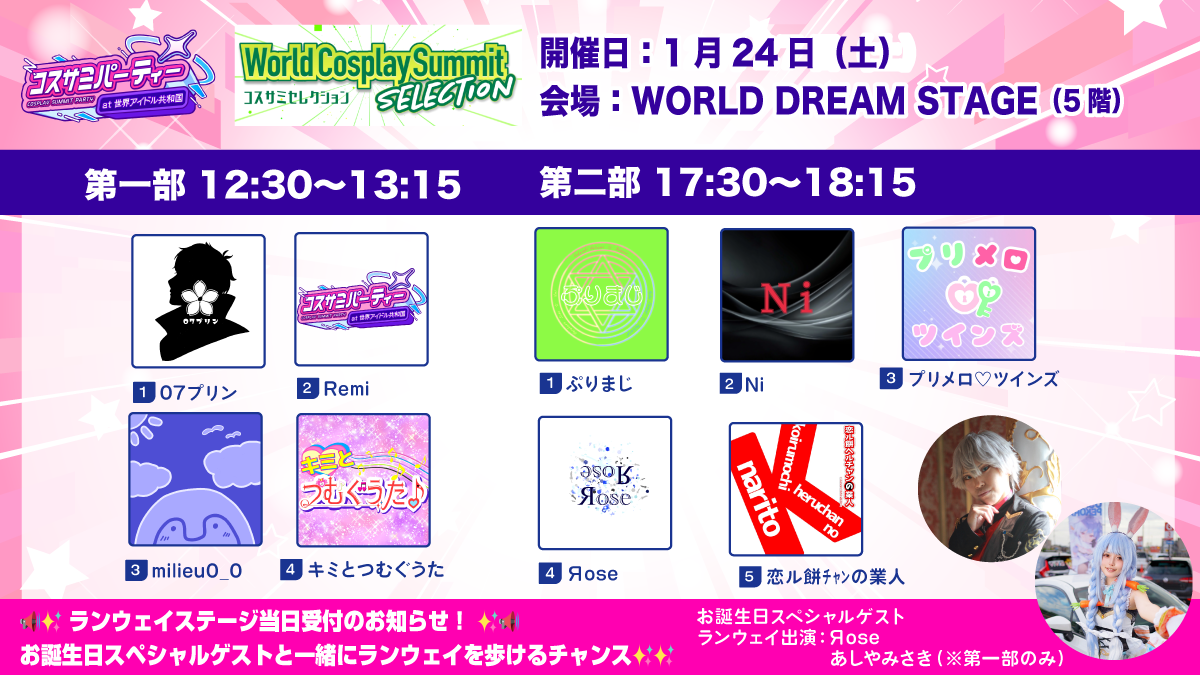 1/24はゲストコスプレイヤーによる華やかなランウェイと、当日受付で集まったコスプレイヤーの皆さまにランウェイしていただく特別企画も開催!